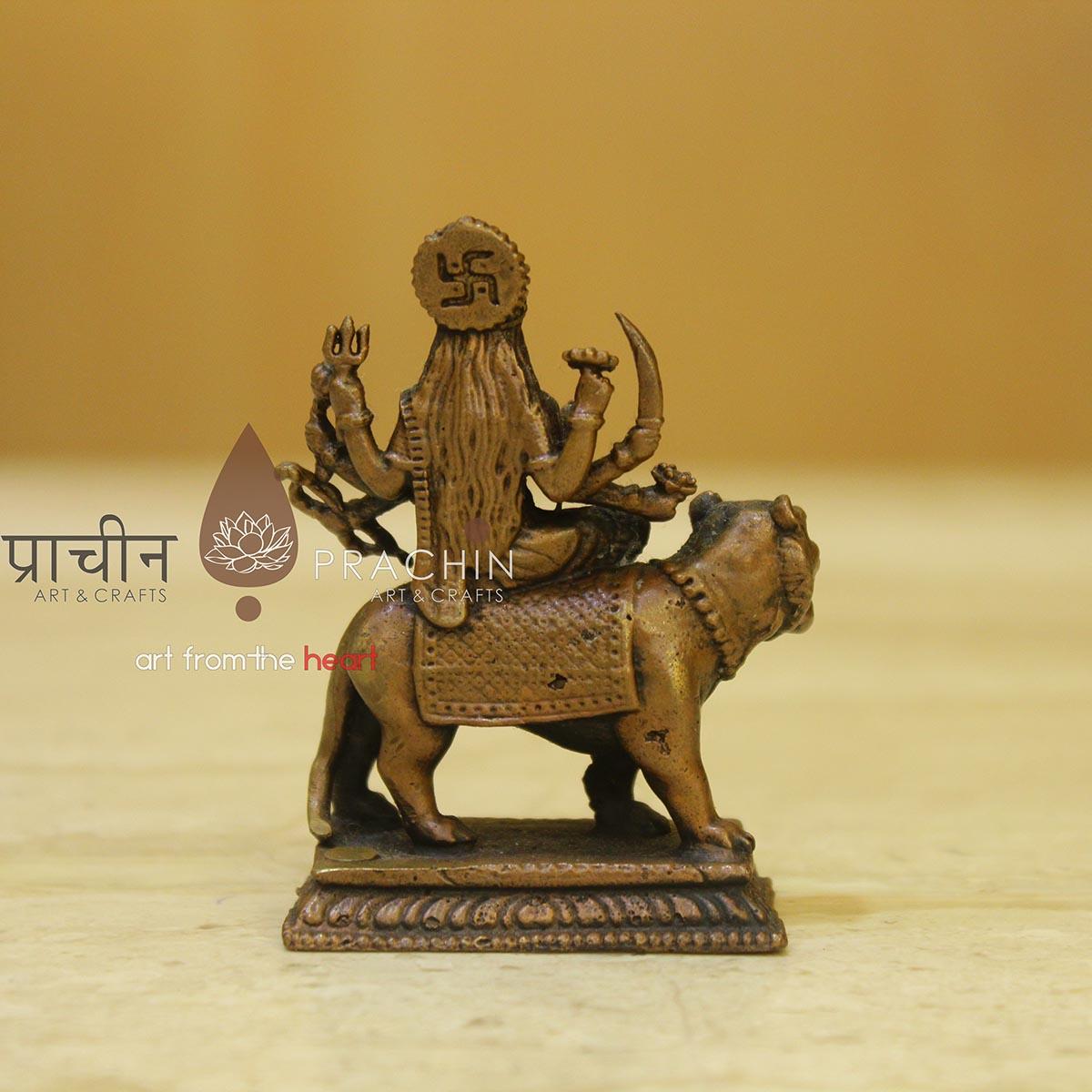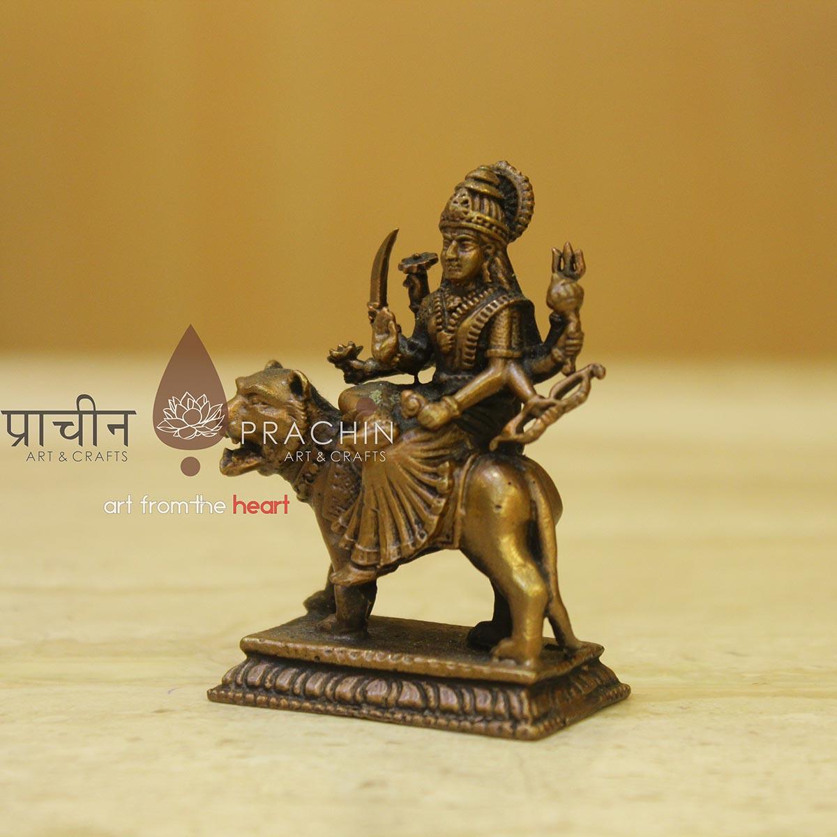 Copper Durgamaa Idol. In Hinduism, the goddess Durga, also known as Shakti or Devi, is the protective mother of the universe. She is one of the faith’s most popular deities, a protector of all that is good and harmonious in the world. Sitting astride a lion or tiger, the multi-limbed Durga battles the forces of evil in the world.
