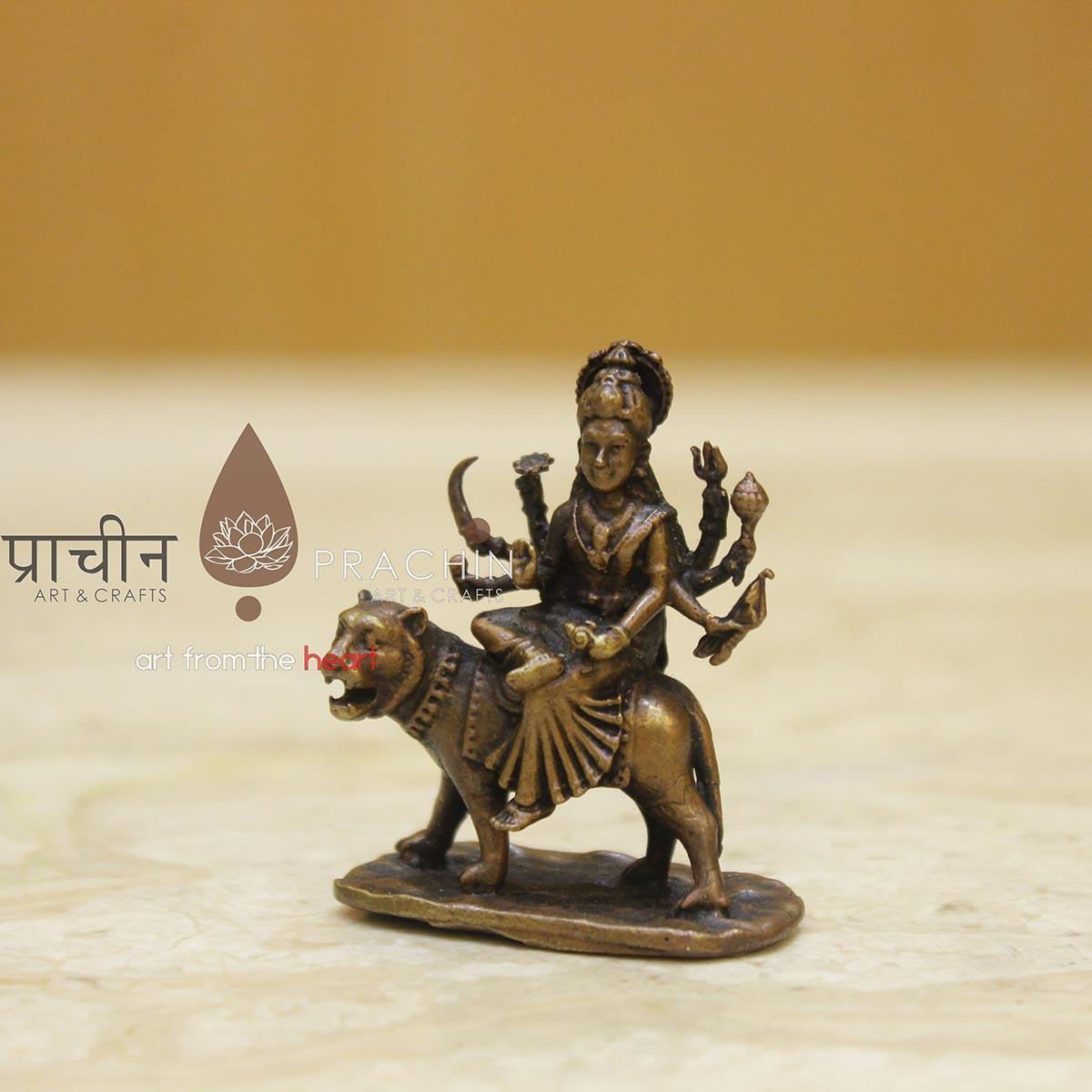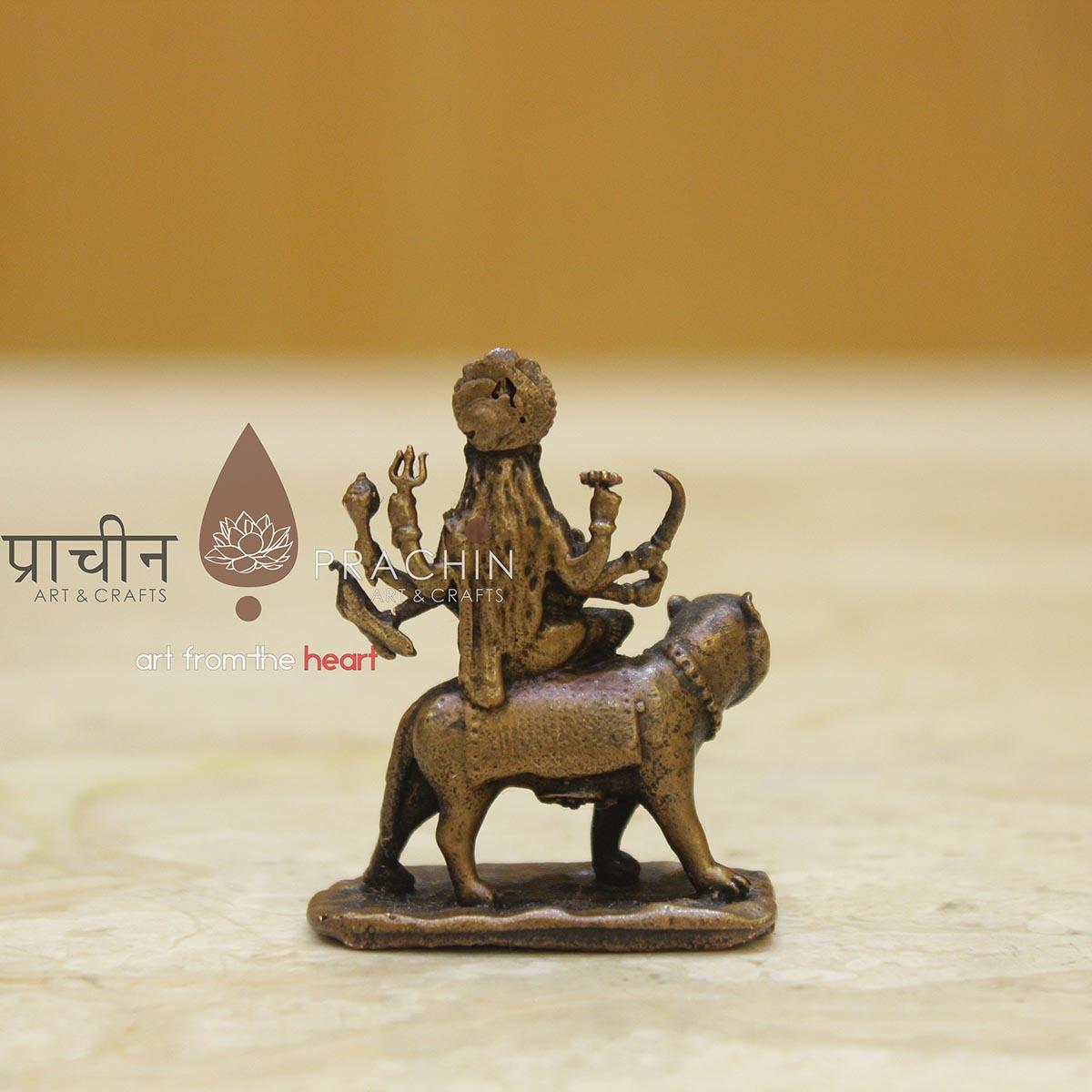 Copper Durgamaa Statue. In Hinduism, the goddess Durga, also known as Shakti or Devi, is the protective mother of the universe. She is one of the faith’s most popular deities, a protector of all that is good and harmonious in the world. Sitting astride a lion or tiger, the multi-limbed Durga battles the forces of evil in the world.