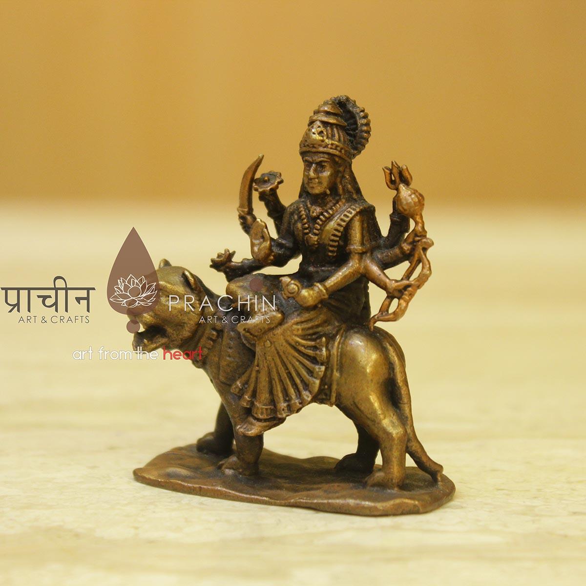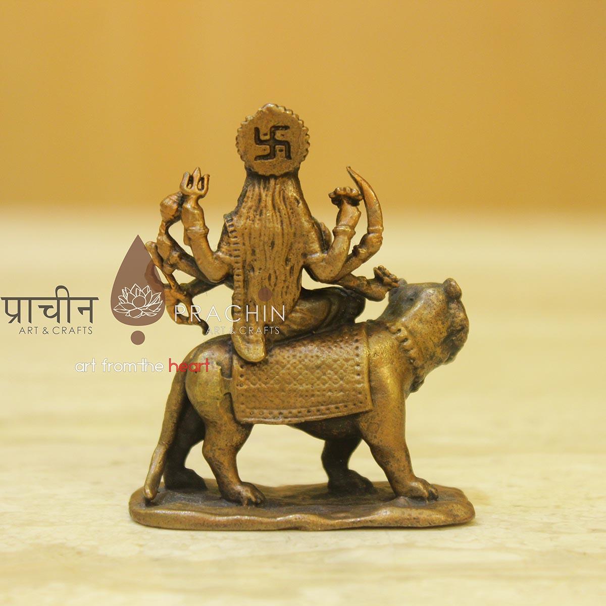 Copper Durgamaa Statue. In Hinduism, the goddess Durga, also known as Shakti or Devi, is the protective mother of the universe. She is one of the faith’s most popular deities, a protector of all that is good and harmonious in the world. Sitting astride a lion or tiger, the multi-limbed Durga battles the forces of evil in the world.