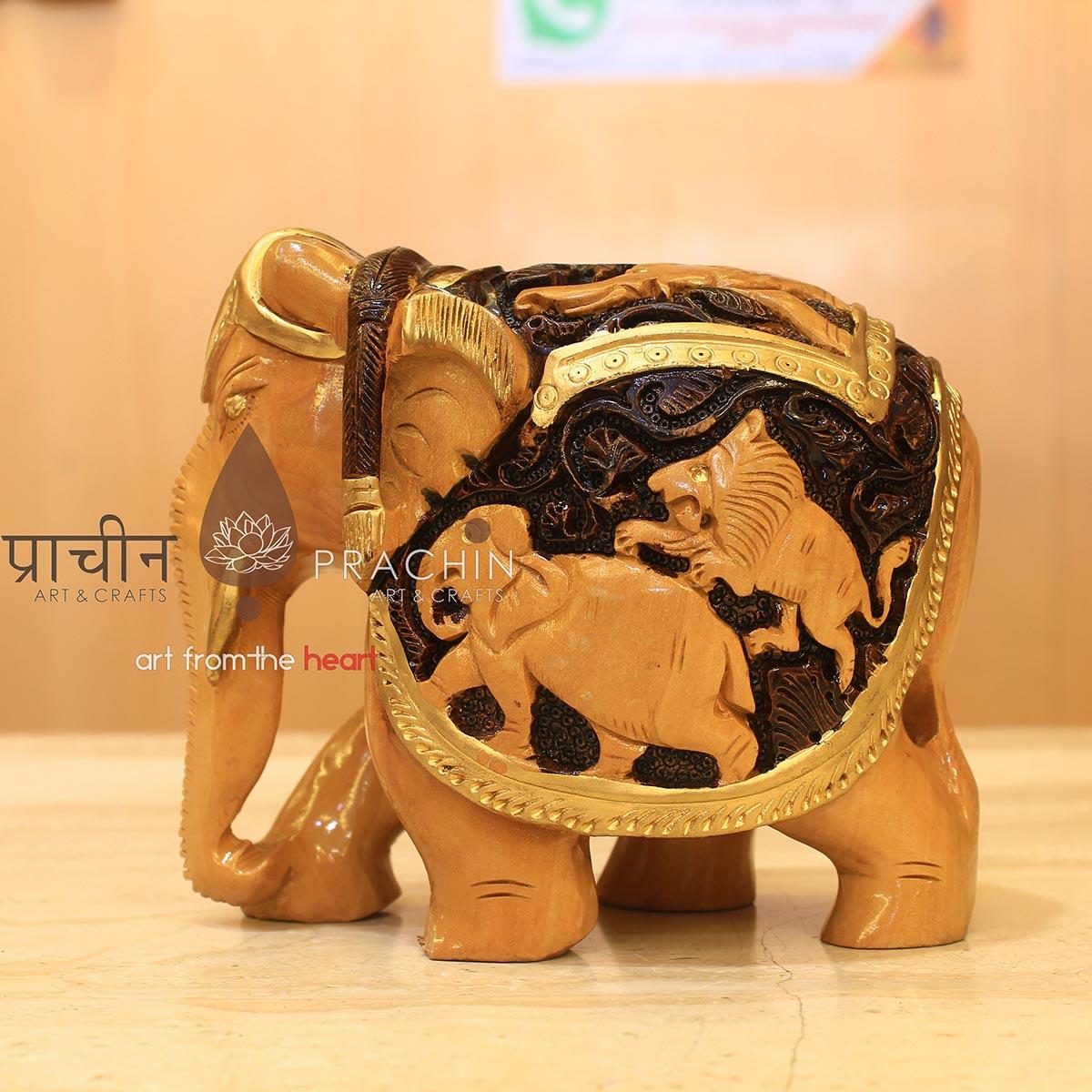 Wooden Elephant With Animal Carving.