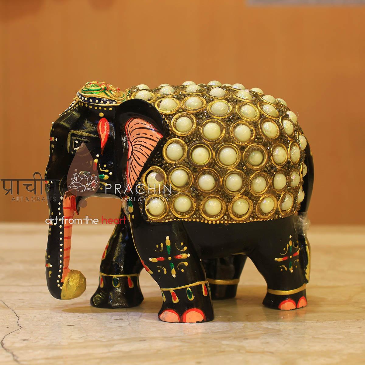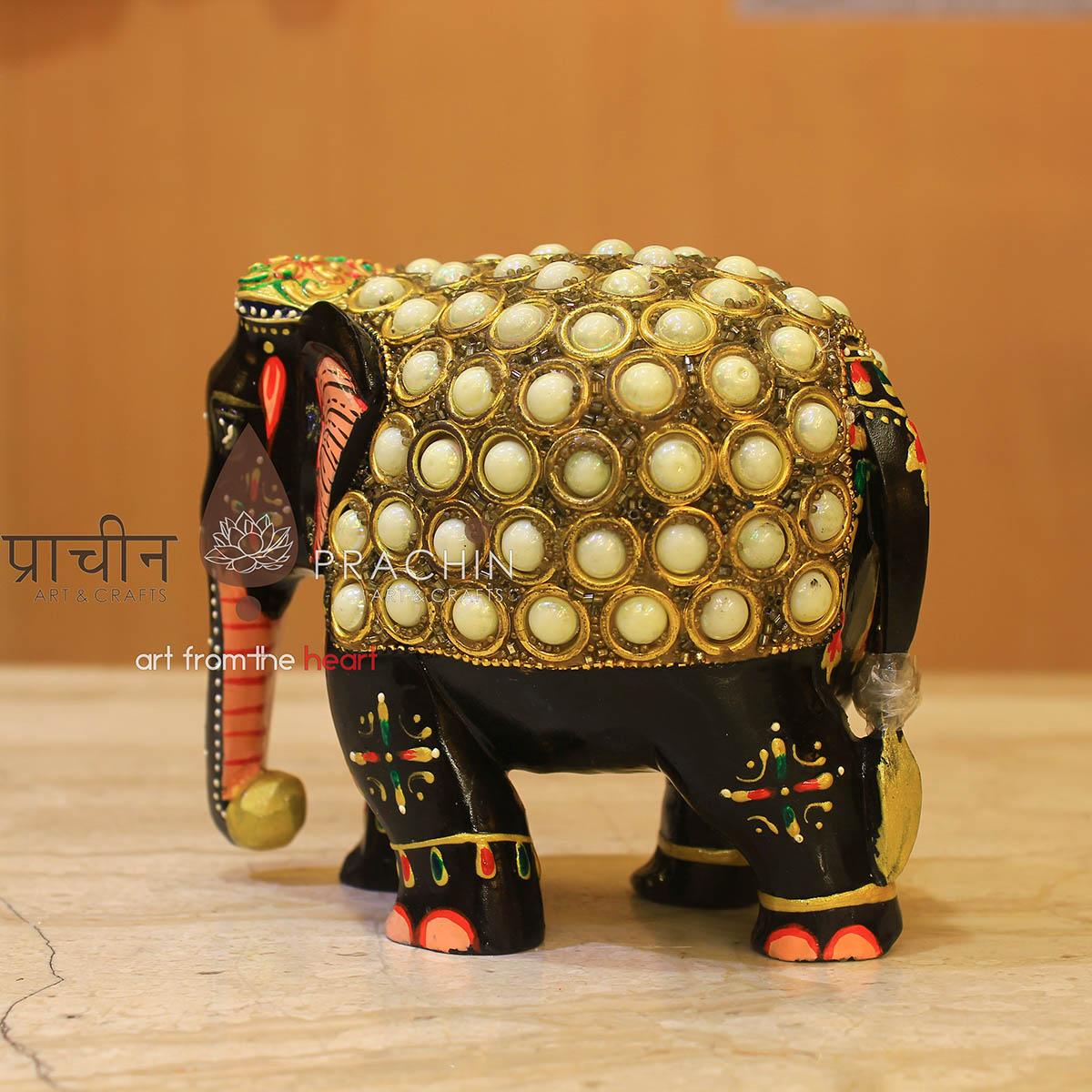 Wooden Elephant With Jewelry Stones Studded Along With Semi Pearl Work.