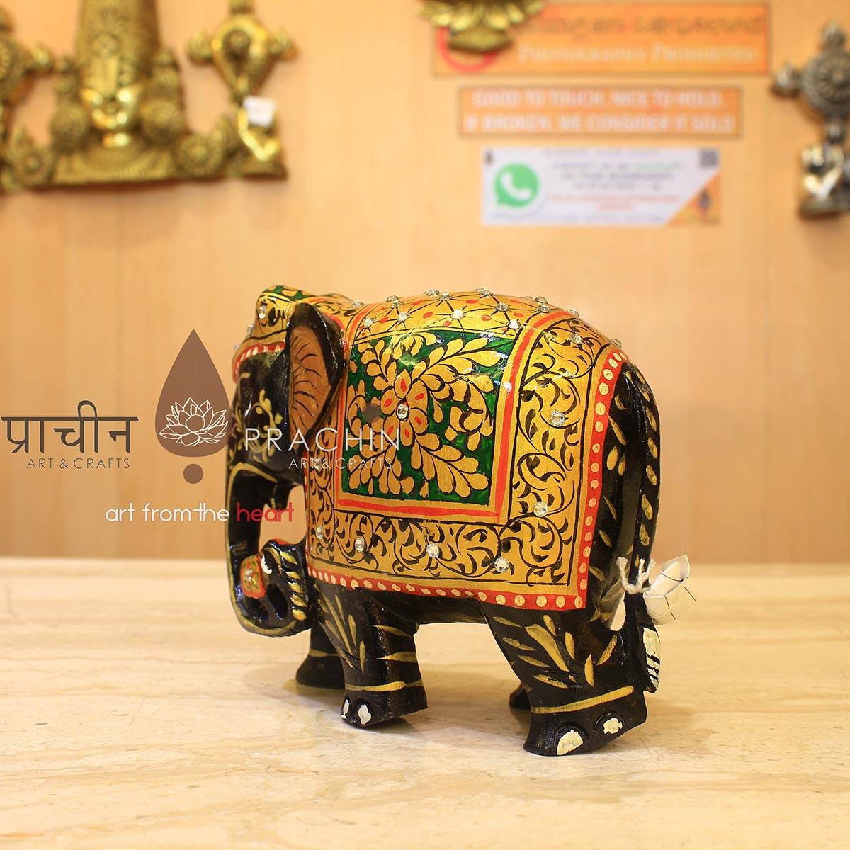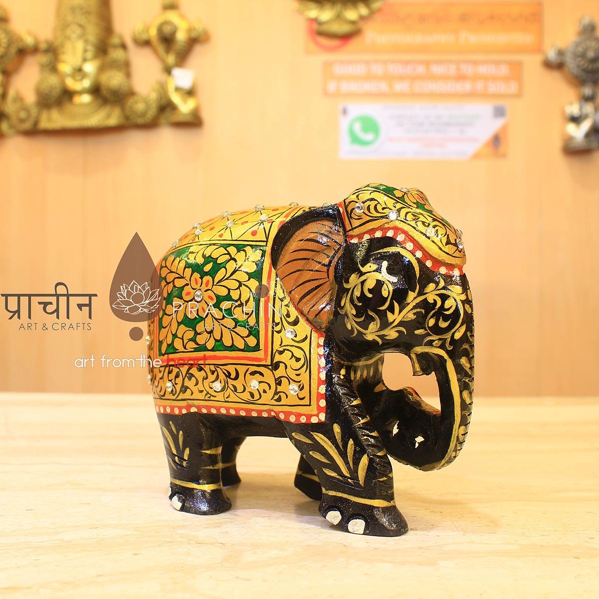 Wooden Elephant With Gold Painting on It Along With Multi-Enamel Work.